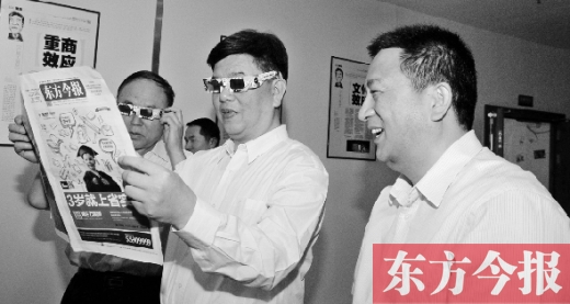 童剛副局長(zhǎng)十分關(guān)心東方今報(bào)的發(fā)展,向東方今報(bào)社社長(zhǎng)趙國(guó)平詳細(xì)詢(xún)問(wèn)了解報(bào)社的新聞宣傳、廣告經(jīng)營(yíng)、發(fā)行情況以及員工待遇,得知東方今報(bào)全省發(fā)行覆蓋、全媒體聯(lián)動(dòng)運(yùn)營(yíng)并在河南率先發(fā)行出版3D版報(bào)紙時(shí),童剛副局長(zhǎng)在調(diào)研現(xiàn)場(chǎng)興趣盎然地戴上3D眼鏡體驗(yàn),并贊揚(yáng)東方今報(bào)的創(chuàng)新走到了前列。