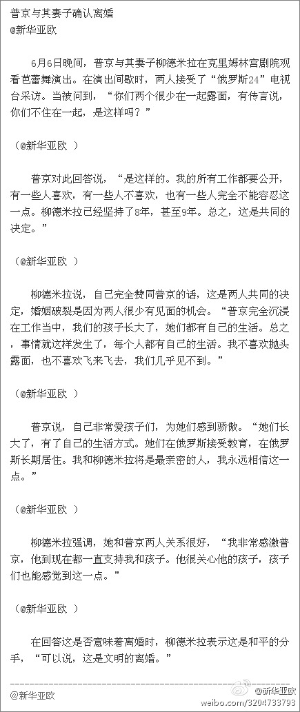 6月6日晚間,普京與其妻子柳德米拉在克里姆林宮劇院觀看芭蕾舞演出。在演出間歇時(shí),兩人接受了“俄羅斯24”電視臺(tái)采訪。當(dāng)被問到,“你們兩個(gè)很少在一起露面,有傳言說,你們不住在一起,是這樣嗎?”普京與柳德米拉在回答問題時(shí)承認(rèn)兩人已離婚。