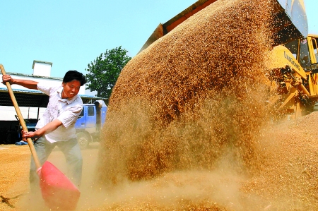 6月12日,息縣彭店鄉(xiāng)張莊村種糧大戶柳學(xué)友正在翻曬麥子。他今年種了2600畝小麥,通過精心管理,平均畝產(chǎn)達(dá)450公斤以上。記者  王天定 攝