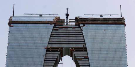 據(jù)了解,東方之門的幕墻規(guī)格有近百種,共需16萬平方米,平鋪在地上相當(dāng)于15個(gè)標(biāo)準(zhǔn)足球場(chǎng)的面積,項(xiàng)目于2012年開始進(jìn)行幕墻安裝。