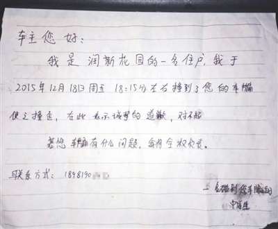 事情發(fā)生在12月18日。柏宇告訴成都商報記者,當(dāng)天下午她外出買了冒菜回家,走到小區(qū)門口,一不留神撞到了旁邊一輛轎車的車頭,彎腰擦膝蓋時發(fā)現(xiàn),轎車車牌面板被撞彎了。隨后,她跑回家寫了一張字條然后把字條貼到了轎車擋風(fēng)玻璃上,“車主您好,我是潤新花園的一名住戶,我于2015年12月18日周五18點15分左右撞到了您的車牌,使之撞歪,在此表示誠摯的道歉,對不起,若您的車牌有什么問題,我將全權(quán)負責(zé)”,她還留下了手機號碼。