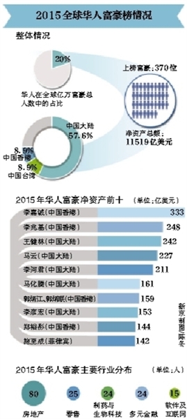 從行業(yè)分布看,華人富豪前十中,房地產巨頭依然占據最多席位。此外,2015年上榜的370位華人富豪中,房地產依舊牢牢占據著第一的位置,有80位、超過20%的華人富豪涉足房地產行業(yè)。其中,大連萬達集團董事長王健林以凈資產242億美元躋身前三,也是大陸富豪第一位。(記者 梁薇薇)