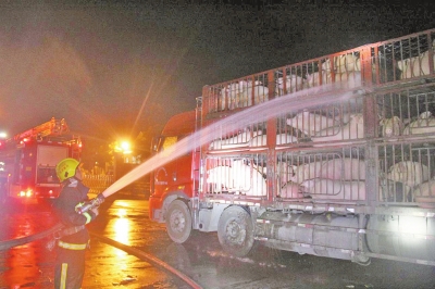 救援的消防官兵告訴大河報(bào)記者,現(xiàn)場(chǎng)需緊急救援的共有3輛運(yùn)豬車(chē),約300頭豬。了解情況后,消防官兵隨即利用水槍向生豬噴水降溫,一個(gè)多小時(shí),原來(lái)無(wú)精打采的生豬開(kāi)始活泛起來(lái),待高速通行司機(jī)連忙開(kāi)往目的地。
