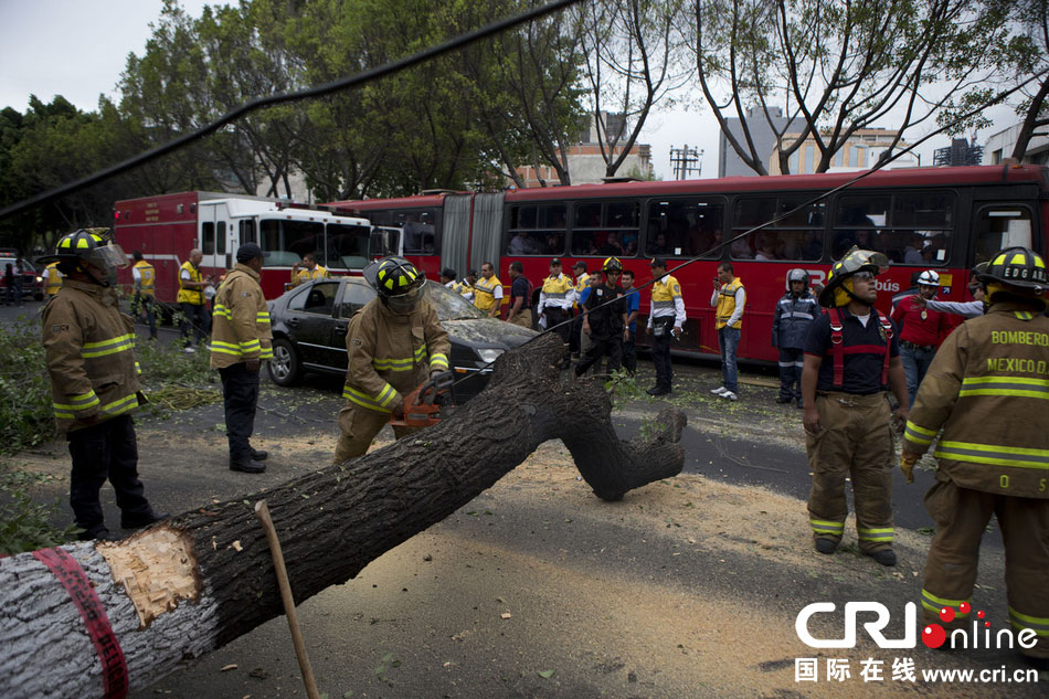 當(dāng)?shù)貢r間2014年5月8日,墨西哥墨西哥城,消防人員正在切割一棵倒下的樹?!D片來源:Rebecca Blackwell/東方IC