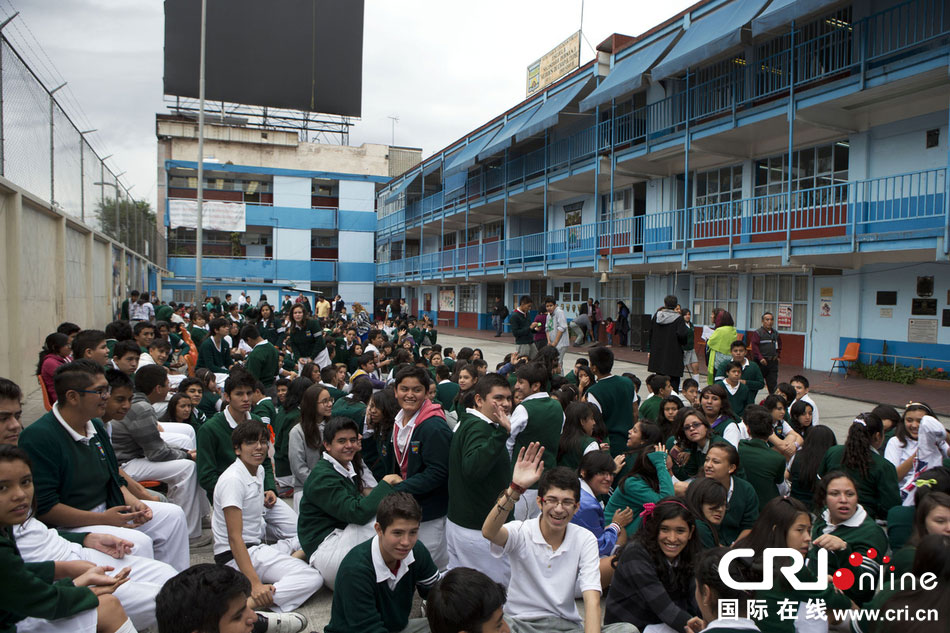 當(dāng)?shù)貢r間2014年5月8日,墨西哥墨西哥城,學(xué)生聚集在庭院內(nèi)?!D片來源:Rebecca Blackwell/東方IC