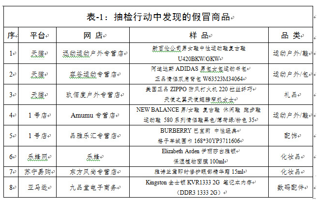 工商總局公布“雙11”期間對(duì)電商平臺(tái)促銷商品的抽檢結(jié)果:已確認(rèn)8批次樣品為假冒商品,天貓3個(gè),1號(hào)店2個(gè),樂(lè)蜂網(wǎng)、蘇寧易購(gòu)、亞馬遜各1個(gè);7批次樣品涉嫌假冒商品正在分析中。另有7批次樣品質(zhì)量不合格或標(biāo)簽不合法。
