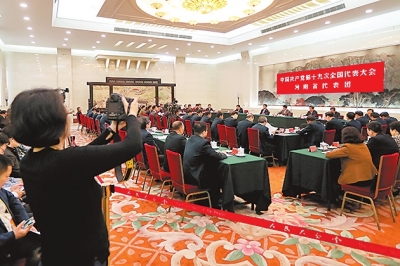 10月19日下午,河南代表團(tuán)在人民大會(huì)堂河南廳討論黨的十九大報(bào)告。(記者 董亮 杜小偉/攝)