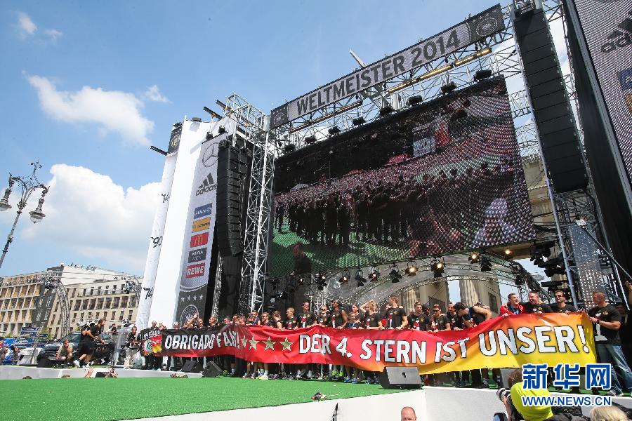 7月15日,德國隊(duì)球員克洛澤(中)、格策(右二)等參加慶?;顒印.?dāng)日,奪得2014年巴西世界杯冠軍的德國國家隊(duì)凱旋歸國。他們前往首都柏林的勃蘭登堡門,與成千上萬的球迷共同慶祝這一歷史性的勝利。7月13日,在巴西里約熱內(nèi)盧馬拉卡納大球場進(jìn)行的2014年巴西世界杯決賽中,德國隊(duì)以1比0戰(zhàn)勝阿根廷隊(duì),歷史上第四次獲得世界杯冠軍。新華社記者張帆攝
