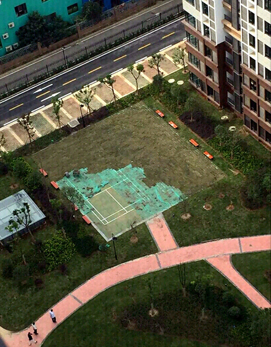 2015年10月12日,湖北武漢市一小區(qū)住宅項目為了通過綠化部門驗收,開發(fā)商可謂煞費苦心:在已建好的球場上鋪上草坪,增加綠化率。