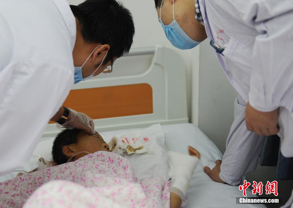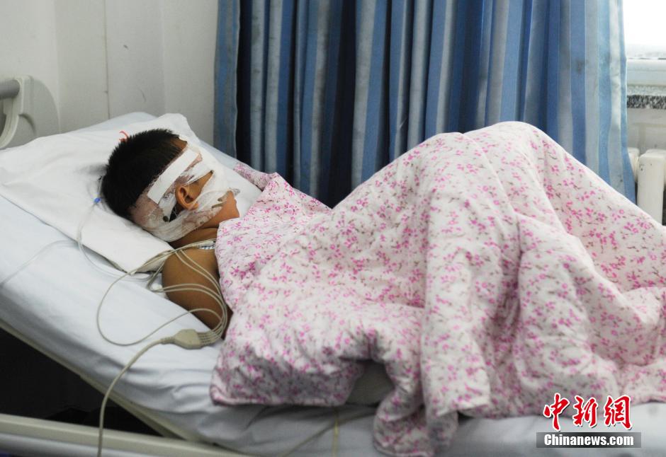 10月13日,12歲的朱某正在吉林大學第二醫(yī)院接受治療。據(jù)其家人介紹,10月11日,朱某獨自在家,遭同村村民王某挖出雙眼,行兇者還點燃了他家的房子,朱某靠裝死逃過一劫。王某事后自殺。目前雖經(jīng)手術(shù)治療,但朱某右眼視力已無恢復的可能,左眼亦不樂觀。警方正對此案進行調(diào)查。中新社記者 張瑤 攝