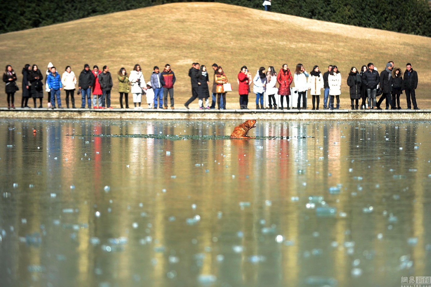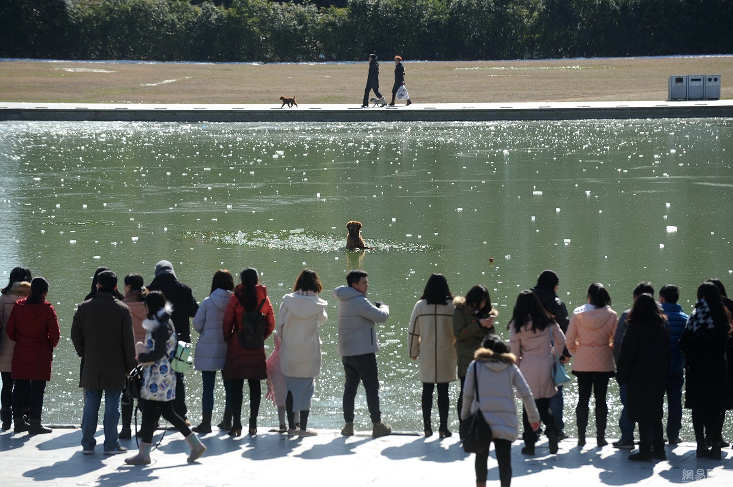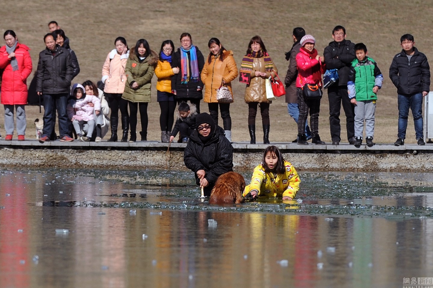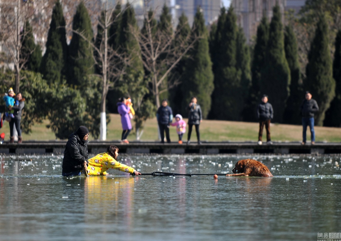 “狗狗主人一直告訴它要用力。”項(xiàng)先生說(shuō)大金毛雖然奮力掙扎,卻無(wú)濟(jì)于事,越掙扎陷得越深,體力也消耗了不少。一旁的狗主人很是著急,決定下水救它,無(wú)奈女同志體力有限,基本破不了冰。不忍看著一個(gè)生命就這樣消失。圖為眾人圍觀被困冰窟的金毛。