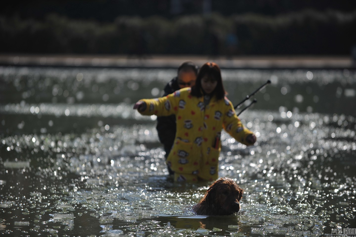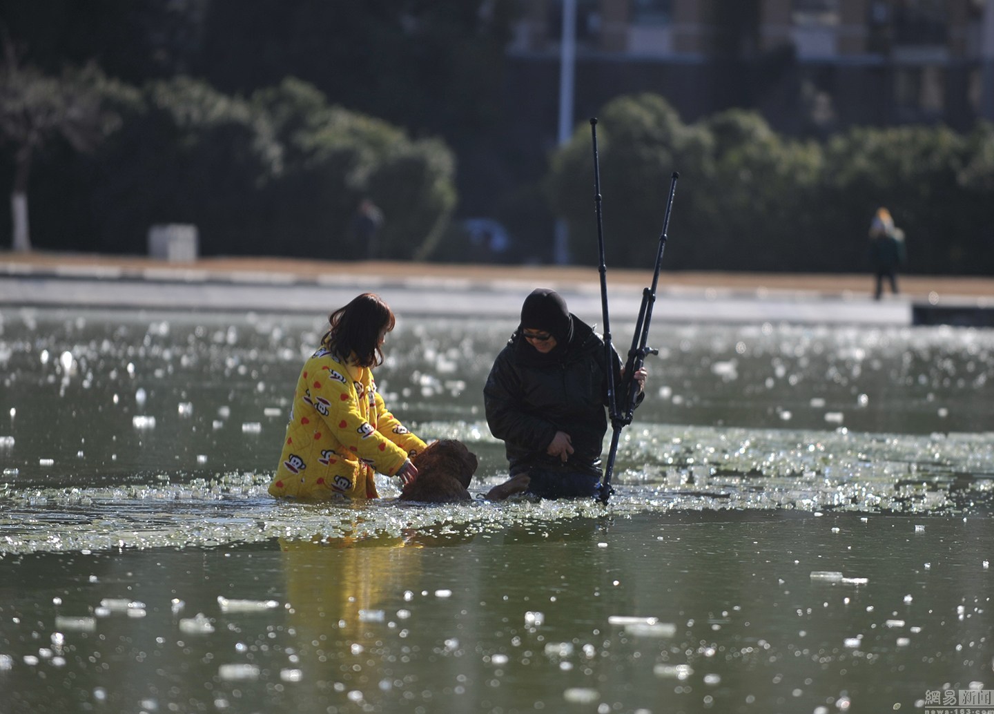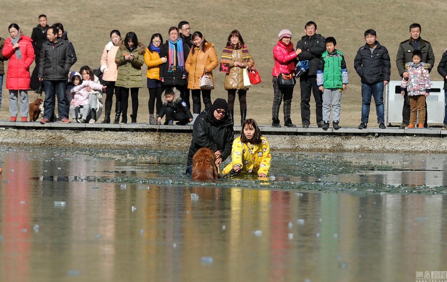 “我知道這水不深,自己又會(huì)游泳。”面對(duì)冰冷的水面,項(xiàng)先生并沒(méi)有多想,只想趕緊救出狗狗。圖為兩人合力救金毛現(xiàn)場(chǎng)。