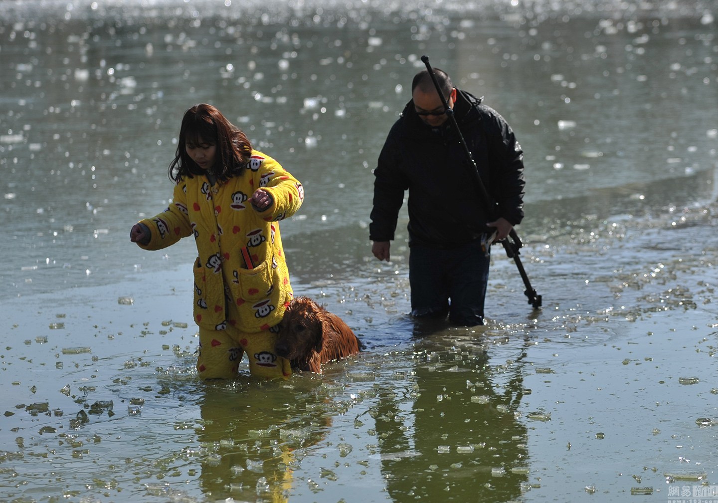 項(xiàng)先生當(dāng)即放下手中的活,拿起拍攝使用的三腳架,直接走進(jìn)冰冷的湖水,敲碎河面上的冰,朝狗狗走去。最后金毛犬獲救。圖為項(xiàng)先生用三腳架破冰下水救金毛。
