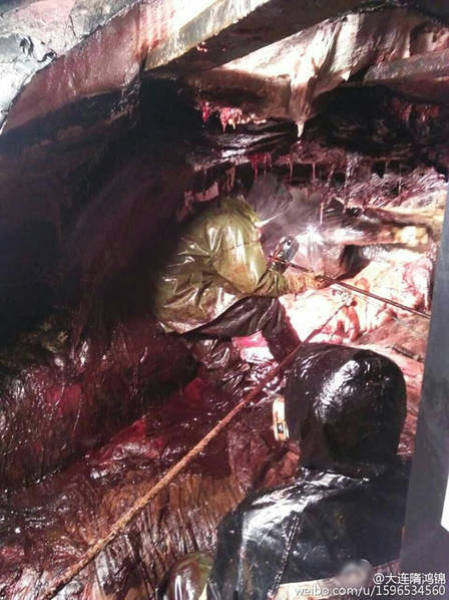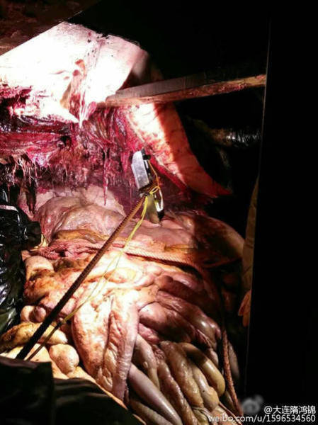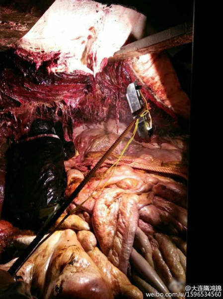2016年2月14日至15日,江蘇如東洋口港海灘先后發(fā)現(xiàn)兩條抹香鯨擱淺死亡。19日,技術(shù)專家開(kāi)始抹香鯨的開(kāi)腹工作,其中一位專家進(jìn)入了抹香鯨的體內(nèi),在工作之時(shí)拍下了體內(nèi)的情況。