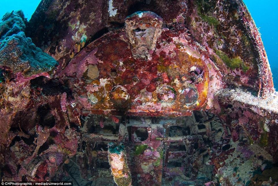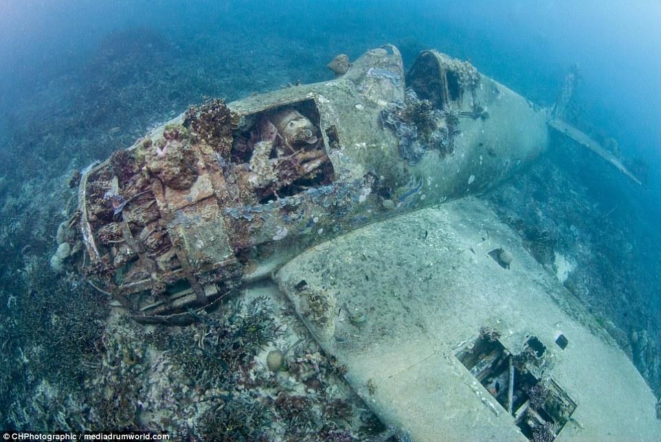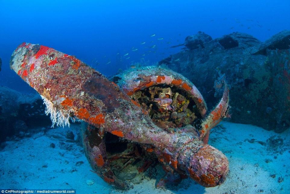 這些曾經(jīng)參與世界大戰(zhàn)的戰(zhàn)斗機(jī)如今安靜的躺在所羅門群島大海185英尺(約56米)的淺層海床上。今夕形成了鮮明的對(duì)比,英勇的美國F6F地獄貓戰(zhàn)斗機(jī)上覆蓋了大量的珊瑚。