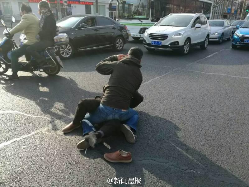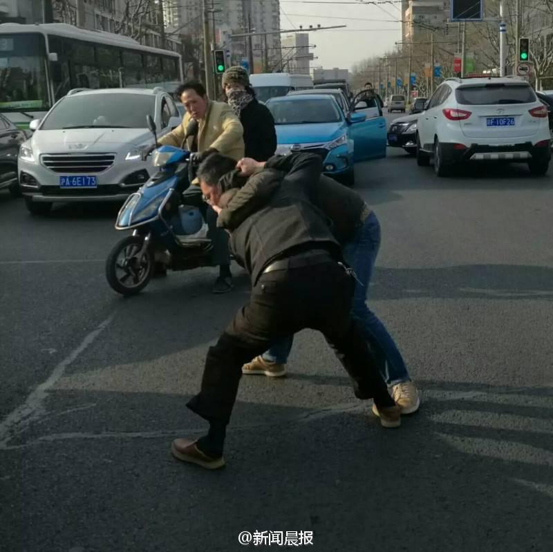 晨報(bào)訊 你一個過肩摔,我一個橫掃腿,接著扭打在一起,互相纏斗難分伯仲……這幕刺激的武打動作場景,昨天早高峰時在上海安波路營口路上演,而沖突竟源于“路怒”!目擊者肖先生告訴記者,昨天上午8點(diǎn)不到,他經(jīng)過安波路、營口路路口時,看看兩名男子扭打在一起,場面十分激烈?!拔翼槃菽贸鍪謾C(jī)拍了幾張照片,旁邊也有行人上去勸架?!毙は壬f,在兩名男子的身旁,一橫一豎停著兩輛轎車,“我想可能是兩個人開車有點(diǎn)摩擦引起的‘路怒’吧。”