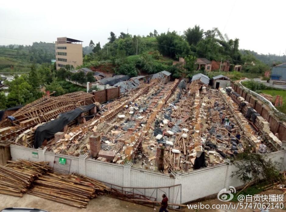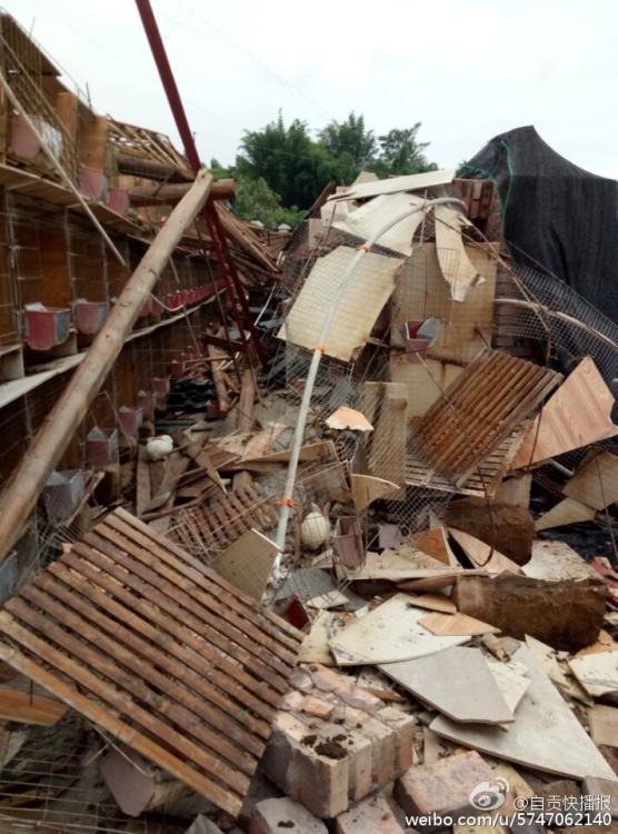 7月12日凌晨5時許,陣性大風(fēng)突襲四川自貢榮縣古文鎮(zhèn),風(fēng)災(zāi)使古文鎮(zhèn)山邊村鄉(xiāng)巴佬養(yǎng)殖基地6000平米兔舍垮塌,事發(fā)時,該兔舍共有26000只兔子。記者在現(xiàn)場看到,兔舍頂棚已經(jīng)被完全吹跨,木制橫梁和隔板隨處散落,部分兔舍仍有大量兔子被埋,10余名工人正在清理現(xiàn)場和搶救活兔。據(jù)兔舍負(fù)責(zé)人介紹,經(jīng)過近30多小時生產(chǎn)自救已搶救出5000余只活兔,初步估計有10000余只兔子死亡,直接損失超過300萬元。(記者 曹實(shí)秋)圖片來源:華西都市報自貢城市頻道官方微博