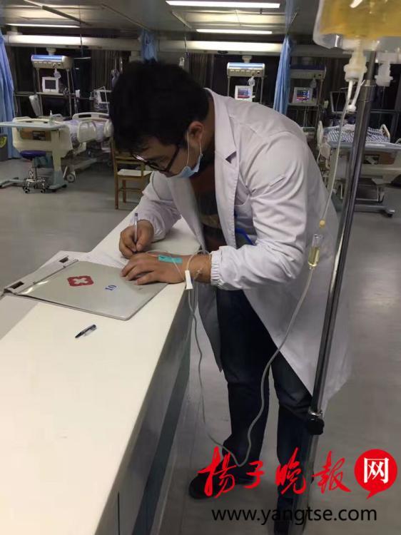 10月29日,一位身穿白大褂帶著口罩的男醫(yī)生,一邊打點滴,一邊為病人下醫(yī)囑的照片,出現(xiàn)在記者的微信朋友圈中。記者獲悉,這位醫(yī)生是江蘇鹽城市濱海縣人民醫(yī)院的一名醫(yī)師,當時正在搶救病人,現(xiàn)場非常感人。圖片來源:揚子晚報網(wǎng)