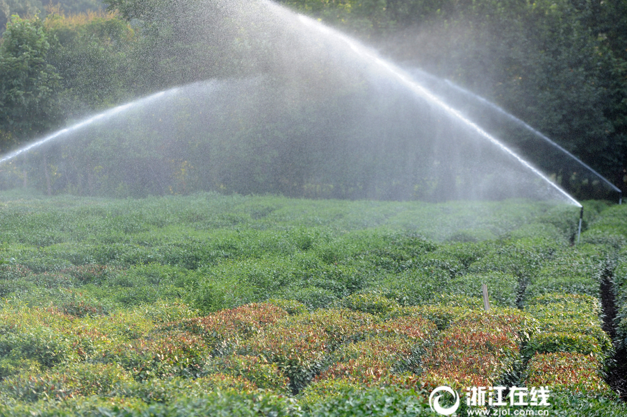 7月27日傍晚,杭州西湖區(qū)雙峰村龍井茶園,全自動(dòng)噴灌系統(tǒng)在為“曬傷”的茶樹(shù)澆水。