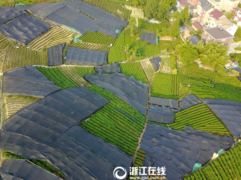 7月27日,俯瞰杭州西湖區(qū)龍塢茶鎮(zhèn),大面積的龍井茶園都撐起了黑色的遮陽(yáng)棚,以免茶樹(shù)被烈日灼傷。