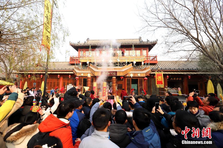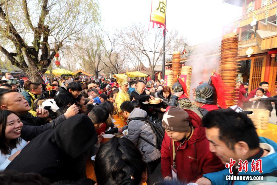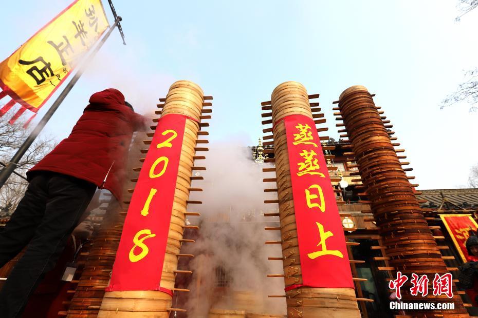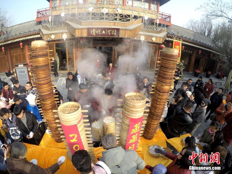 2018年1月1日,河南開封清明上河園孫羊正店門前,現(xiàn)場高高疊起的小籠包熱氣騰騰,小籠包上喜慶的紅字寫著“2018”“蒸蒸日上”。“宋徽宗”帶領(lǐng)“后宮佳麗”為游客免費發(fā)放剛剛蒸好的小籠包,寓意新的一年“蒸蒸日上”,吸引數(shù)千名游客爭相品嘗求好運。據(jù)清明上河園市場部石經(jīng)理介紹,為了給游客送上這份新年祝福,清明上河園啟用了多個地方一起蒸小籠包,當(dāng)天共準(zhǔn)備了2018籠開封名吃“灌湯包”,在多個發(fā)放點陸續(xù)為民眾送上新年的“免費午餐”,祝愿大家都能夠在新的一年里“蒸蒸日上”。中新社記者 王中舉 攝