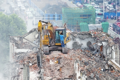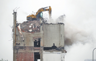 一輛拆遷機(jī)械正在對建筑進(jìn)行粉碎,揚(yáng)塵滿天飄散。
