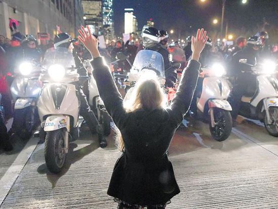 12月3日,美國紐約一個大陪審團(tuán)投票決定,將不起訴扼死黑人小販的涉事警察。裁決宣布后,紐約市長呼吁不滿者和平示威,紐約市民則再次走上街頭抗議。