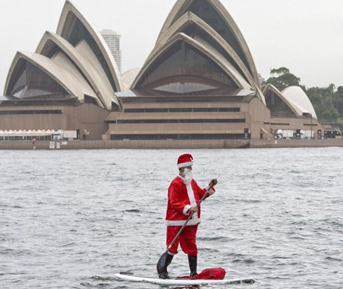 如今圣誕老人出門不單是靠雪橇了,在澳大利亞,這里高能的圣誕老人可以在劃槳板上表演水上漂來慶祝圣誕。據(jù)報道,澳大利亞當?shù)貢r間12月18日,在悉尼港圣誕老人劃槳經(jīng)過P&O郵輪公司的“太平洋寶石號”。由于當?shù)赜洼喒I(yè)迅速增長,將有6000名澳大利亞人登上P&O郵輪公司的油輪和圣誕老人一起慶祝圣誕節(jié)來臨。