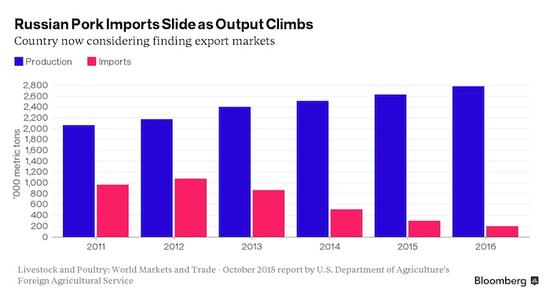 據彭博社報道,美國農業(yè)部數據顯示,俄羅斯國內豬肉產量四年里增加了26%,創(chuàng)下了歷史最高水平;與此同時,進口從2012年的峰值下降了超過80%。