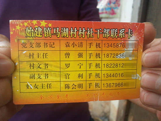 為方便聯系,村支書發(fā)放給村民們的聯系卡。