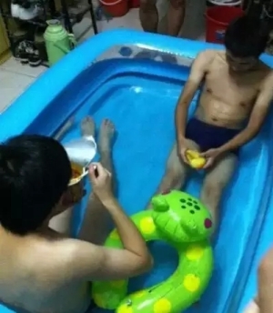 對于沒有空調的宿舍,夏天是最難熬的??磥頌榱吮苁睿瑐兿氡M了各種奇葩招數(shù)?。∷奚峋尤贿€有泳池?。『芮鍥霭。?!有木有!??!