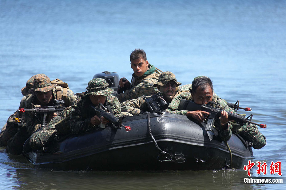 4月25日,美國與菲律賓“肩并肩2012”聯(lián)合軍演參演部隊在菲律賓南部巴拉望省普林塞薩港市的阿魯甘灣舉行“兩棲登陸”演練,美菲雙方近百名海軍陸戰(zhàn)隊士兵參加。這也是美菲“肩并肩2012”聯(lián)合軍演開幕10天以來,開放媒體采訪規(guī)模最大的一場軍事演習活動。圖為美菲海軍陸戰(zhàn)隊士兵混合編隊,搭乘小艇抵達演習地點。張明 攝