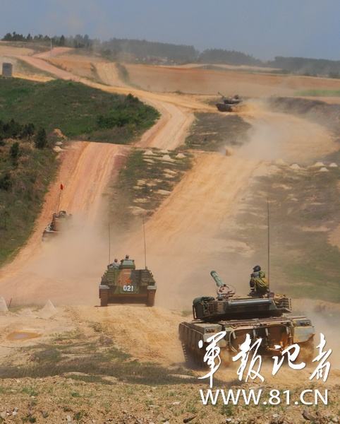 南京軍區(qū)某部把部隊(duì)拉到野外生疏地域展開實(shí)兵檢驗(yàn)性演習(xí),錘煉復(fù)雜電磁環(huán)境下部隊(duì)遠(yuǎn)程機(jī)動、指揮控制、偵察預(yù)警和火力打擊能力。圖為4月下旬,該部坦克梯隊(duì)向演習(xí)地域開進(jìn)。(龐祥川)