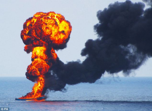 海盜船被擊中,冒出熊熊烈火