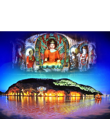 夜色下的龍門在各色燈光的映照下美輪美奐,萬千佛陀現(xiàn)金身。記者 陳曉東 攝 啟天 制圖