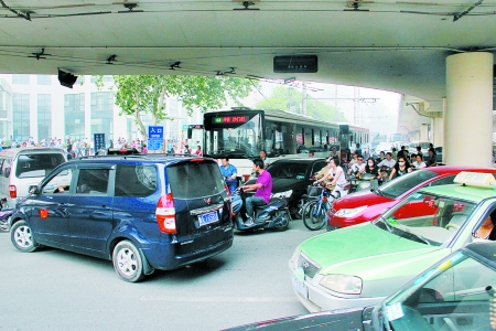 記者注意到,鄭大一附院的地下停車場(chǎng)入口設(shè)置在河醫(yī)立交橋的東南角,而看病車輛駛?cè)脶t(yī)院必須占用非機(jī)動(dòng)車道,等候進(jìn)入醫(yī)院的車輛很容易擁堵。