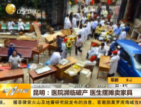 9月1日下午,在位于西山區(qū)麻園路9號的云南博愛醫(yī)院100平方米左右的院子里,各式各樣的家具雜亂地擺放著,有病床、床頭柜,還有護士辦公的前臺。家具中間站著幾十個人,穿著醫(yī)生和護士的制服,賣力地叫賣著。該醫(yī)院副院長稱,博愛醫(yī)院租用的場地到期,而且醫(yī)院投資失敗瀕臨破產,只得變賣資產安置醫(yī)護人員。