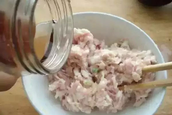 2. 碗里放入豬肉末,鹽,料酒,胡椒粉,蔥末,姜末,少許白菜碎。分次倒入花椒水?dāng)嚧蛏蟿拧?/p>
