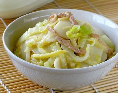 這白菜肉絲炒年糕大概每個上海煮婦都做上過幾回吧,天冷的時候,大棵的白菜囤起來,切兩根年糕,撒點(diǎn)肉絲,調(diào)味簡簡單單,少許鹽和醬油點(diǎn)個味就行。說是炒年糕,其實(shí)是半湯的,有少許濃稠的湯汁在里頭,年糕軟糯,吸收著大白菜和肉絲的湯汁,吃一小碗就暖心暖胃。