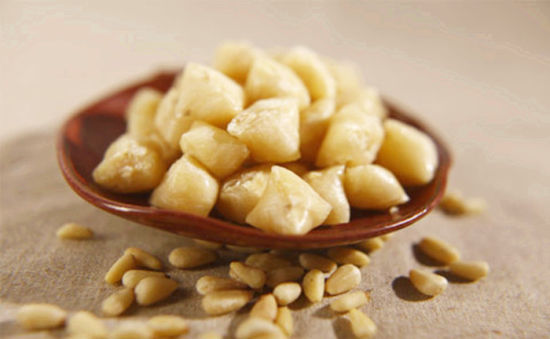 做法:先將白砂糖放入鍋中加少許水,用文火煎熬至粘稠,再加入松子仁,調(diào)勻。然后繼續(xù)煎熬,直至用鏟子挑起成絲狀,不粘手時(shí),?;穑瑢⑻堑乖谕坑惺秤糜偷谋P中,待稍涼,將糖切成小塊,即可食用。