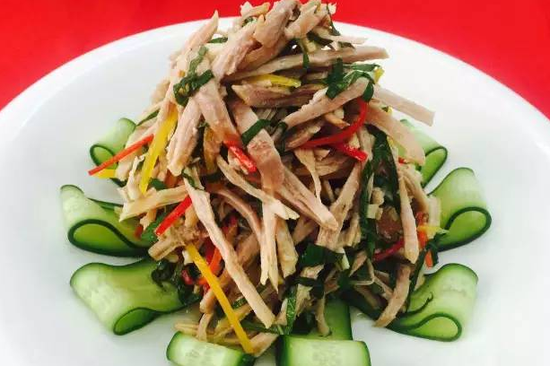 3.薄荷葉改刀成條,搭配青紅彩椒絲,連同手撕肉一起放進盆中,用鹽,蒜蓉,白醋,香油和蔥油調(diào)味,攪拌均勻即可。