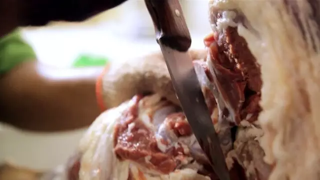 選用本地兩個月的小山羊,據(jù)說體重在40斤左右的口感最好,每天下午進行阿訇宰后,肥瘦相間的羊肉就送到了果園,師傅叉起一塊羊油開始抹,這動作看的吃貨一頭霧水。