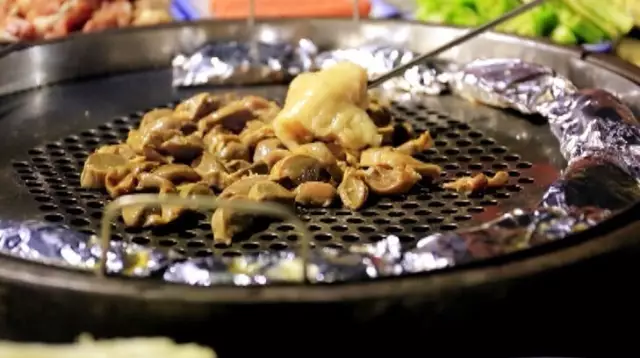 羊油融化后滲透到雞胗里,更是增添了別樣的風(fēng)味,雞胗烤的差不多時,就可以放入切好的羊肉,再撒上香腸洋蔥和辣椒。
