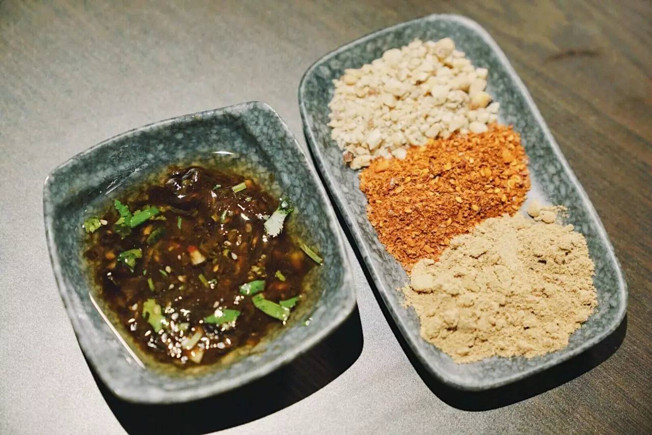 蘸料分為干碟和油碟(別找了,沒有芝麻醬),干碟里是花生碎、辣椒碎、豆粉;油碟里是香油、蠔油、蒜末,配上蔥花和香菜。蠔油可謂油碟的靈魂,是店家調(diào)制好的,可以根據(jù)自己喜好增減。