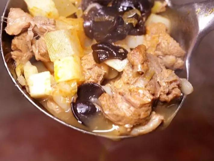 新鮮牛骨羊骨雞骨熬兩個(gè)多小時(shí),直到湯色泛白出現(xiàn)黏黏膠質(zhì),才能倒入臊子中。蘿卜、土豆和木耳的加入,也豐富了臊子口感。做好的臊子湯色紅潤香氣撲鼻,這才是一碗臊子面的靈魂。