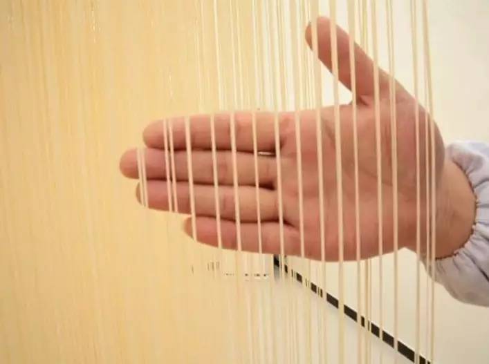 接下來的上面非??简?yàn)眼力和手指的靈活度,搓細(xì)的面以八字結(jié)繞在木棍上,上下飛舞卻紋絲不亂,看的人眼花繚亂。上好的面條根根粗細(xì)均勻間距相同,精致的如同工藝品。