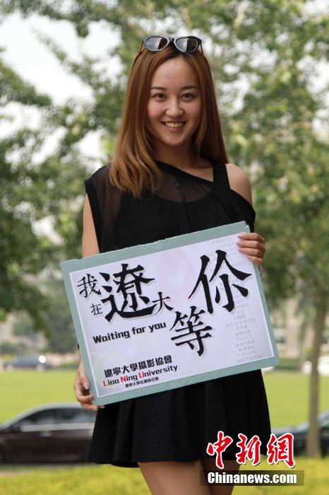6月23日,美女拿著“我在遼大等你!的牌子在拍照。當(dāng)日, 遼寧大學(xué)攝影協(xié)會(huì)推出一組遼大創(chuàng)意“招生名片”照片,在網(wǎng)絡(luò)爆紅出鏡的數(shù)位帥哥靚妹抓人眼球。中新社發(fā) 于海洋 攝